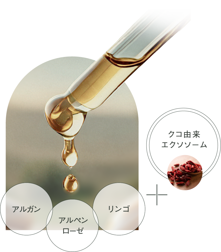 クコ由来の幹細胞エクソソームに、強靭な生命力をもつ植物から抽出した幹細胞由来エキスを掛け合わせ。ハリ・ツヤ感をアップさせるエイジングケア※5成分として、年齢によるゆらぎをサポートします。
