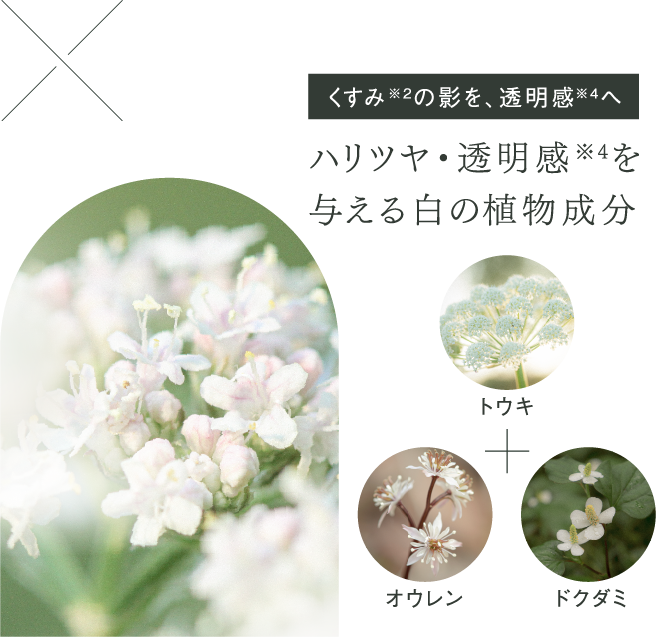 過酷な高原の地に咲く、白い花。その美しさの裏には、たしかな生命力が宿っています。その強さを受け継いだ植物エキスだけを、「白の成分」として掛け合わせ配合。外的刺激によるくすみ※2をケアし、確かな手応えを届けます。
